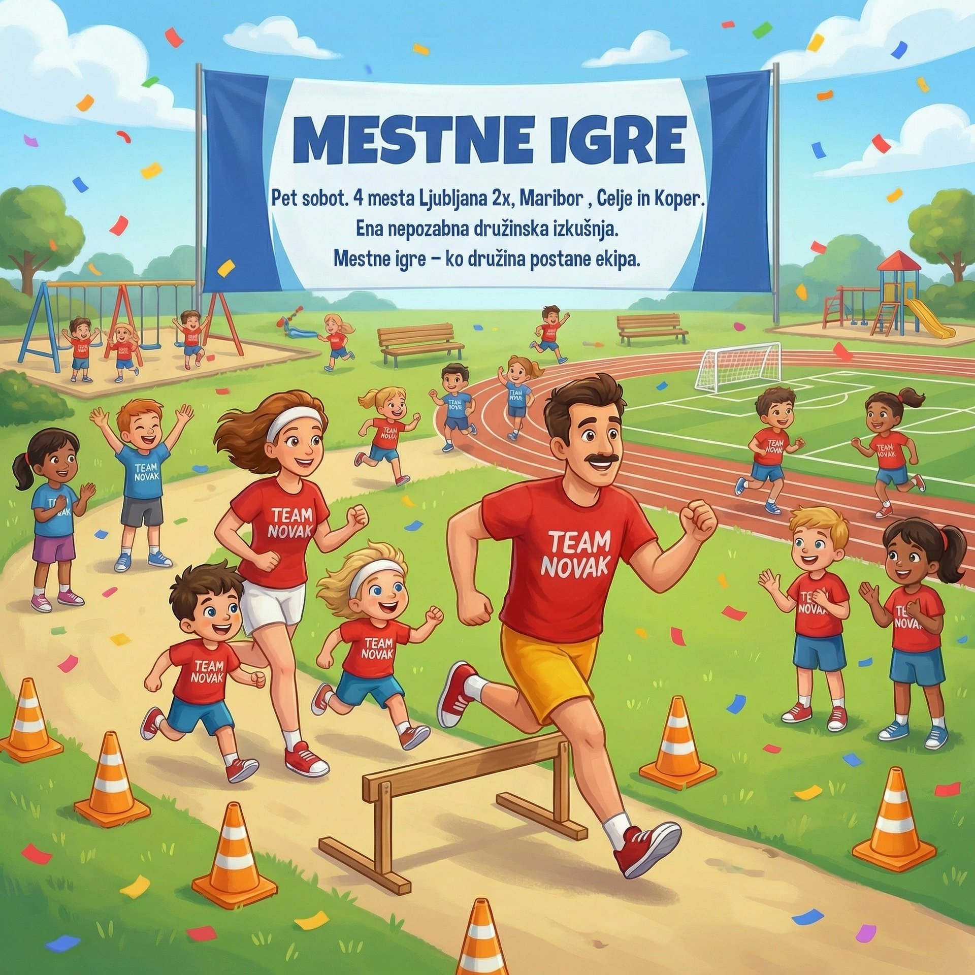 Mestne igre so potujoča športna liga, ki družine vsako soboto popelje v novo slovensko mesto. Otroci in starši se povežejo v ekipe, skupaj tekmujejo, se smejijo in premagujejo izzive – vsaka sobota pa prinese novo prizorišče, novo energijo in nove prijatelje.
